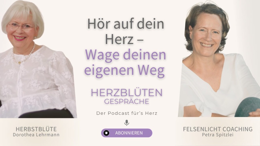 So oft wissen wir tief in uns, was sich richtig anfühlt. Und doch folgen wir stattdessen Erwartungen, alten Mustern oder dem, was „man eben so macht“. In dieser Folge der Herzblüten Gespräche sprechen Dorothea Lehrmann und Petra Spitzlei darüber, wie wir den Mut finden können, unserem Herzen zu folgen – und unseren ganz eigenen Weg zu gehen.